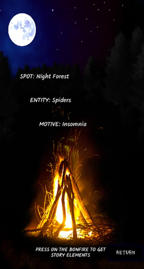 Campfire - is a generator of scary story motives for telling terrible stories. Each player has to tell a terrifying story by using all generated elements. Three features are generated - spot, entitiy and motive.