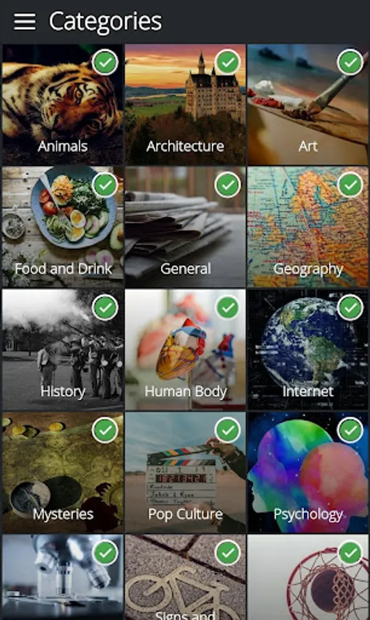 1. Categories : Animals, Architecture, Art, Food and Drink, General, Geography, History, Human Body, Internet, Mysteries, Pop Culture, Psychology, Science and Technology, Signs and Symbols, Sports, Universe, Video Games, Words and Phrases.