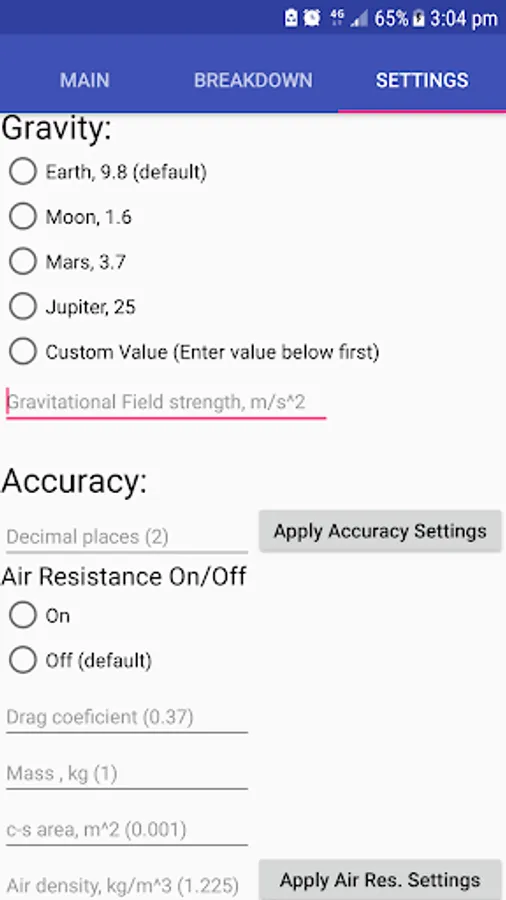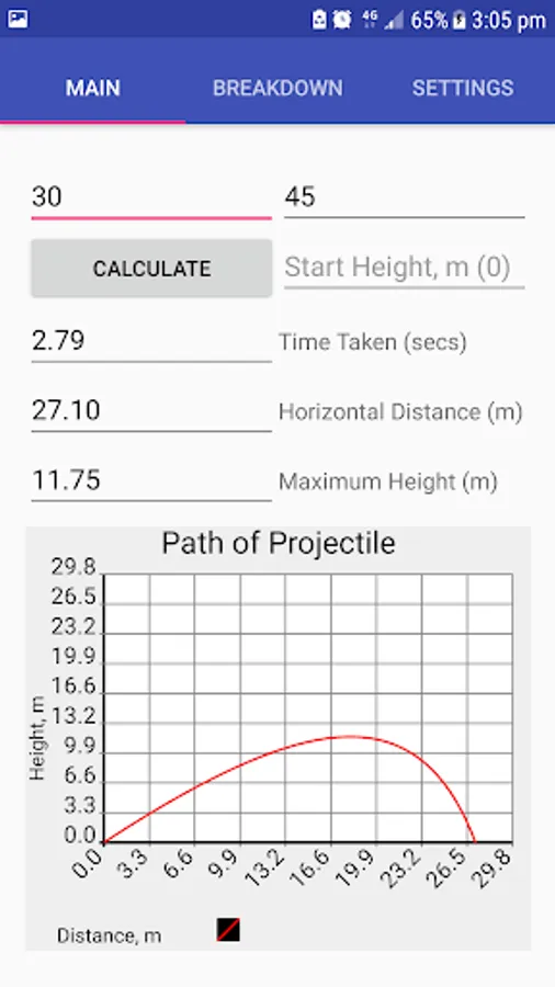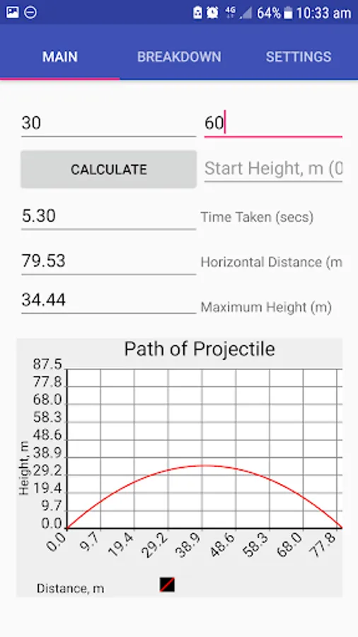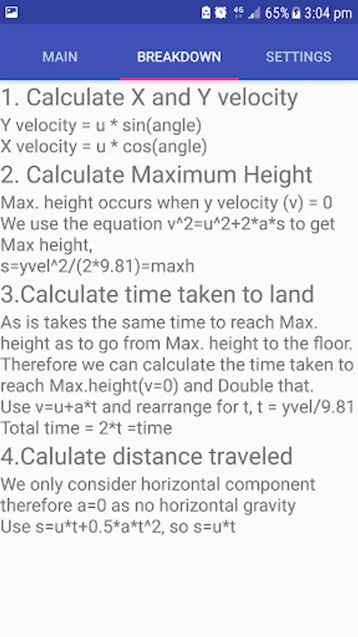 This app can plot a graph showing the path of a projectile from the initial velocity and angle of launch and shows step by step instructions on how it was solved. Includes setting for air resistance, gravity and different launch heights.
