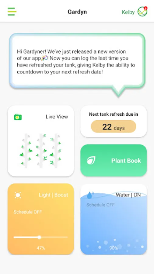 - Let Kelby, your smart private gardener, take care of your Gardyn and optimize it for you