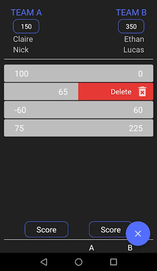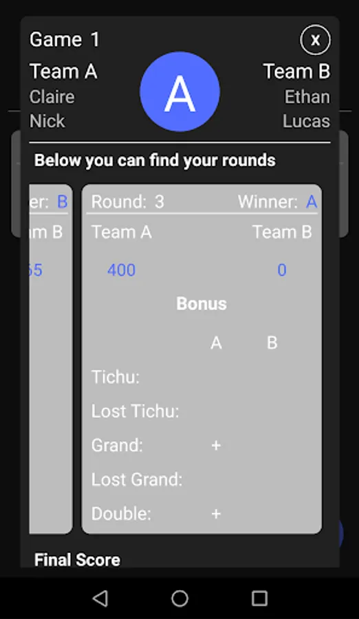 During a game, users have the ability to delete a round by swiping left. Finally, in the main screen of the app, players can see the finished games and the details on each one of them(e.g. successful tichu, lost grand).