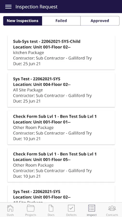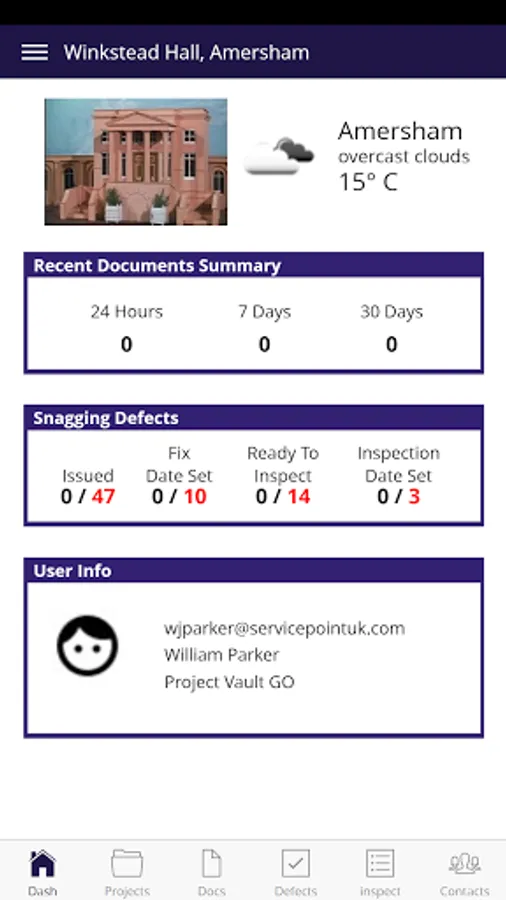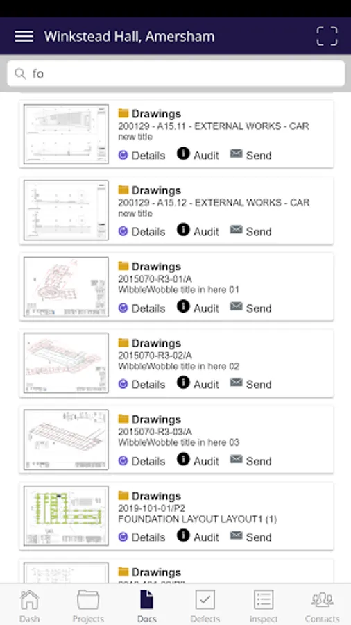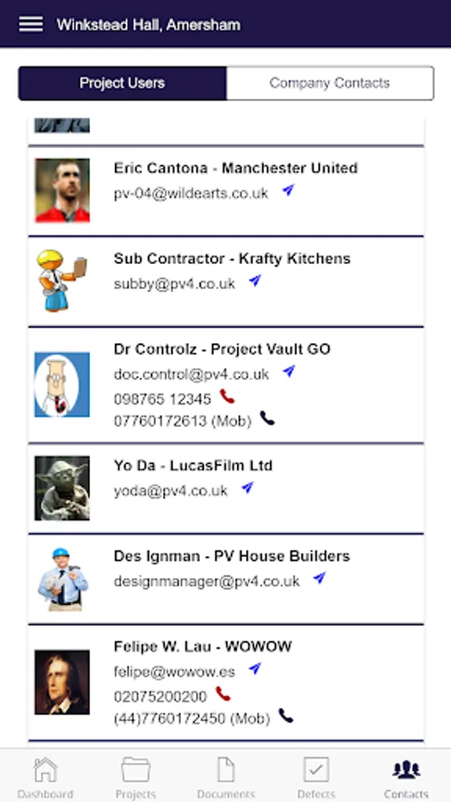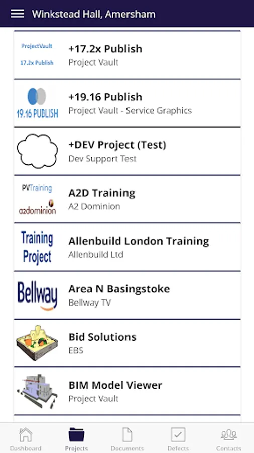 The application allows the user to select a project, search, view and issue current documents, create snag/defect issues, send email or call other users on the project contacts list.