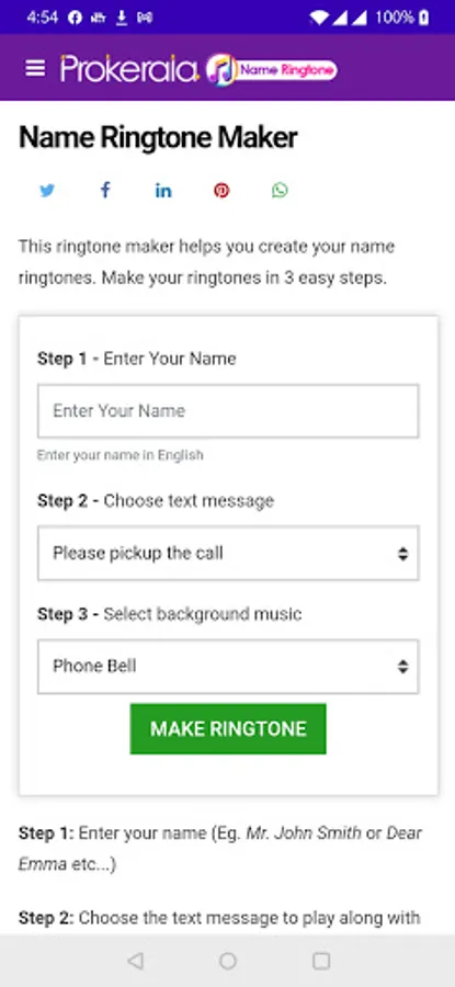 The name ringtone maker helps you make ringtones with your name and beautiful music background. This ringtone maker will create your personalised name ringtone online in just 3 easy steps and download your ringtone. Its absolutely free.