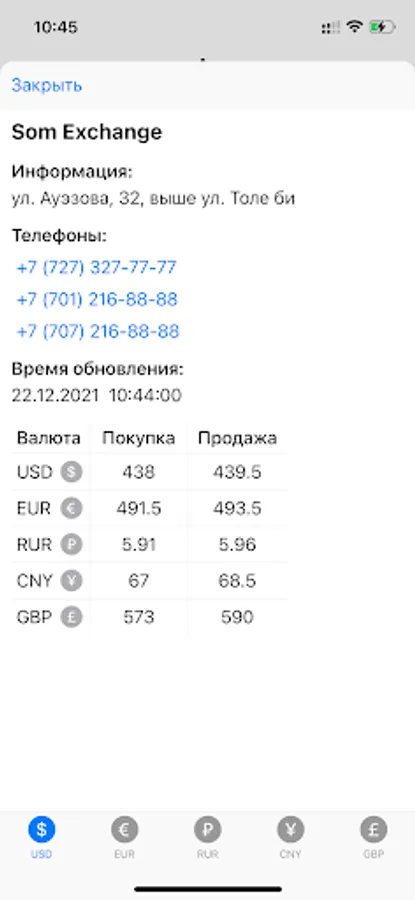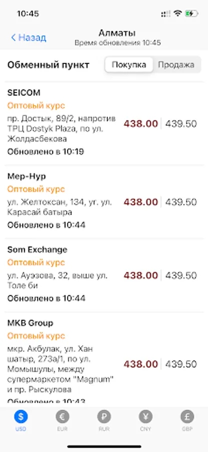 The application allows you to access exchange rates at exchange offices in Kazakhstan.