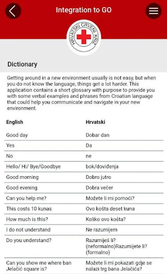 The features included in the application are GPS, links to major institutions, and a dictionary of terms. The content of the application about Croatia has been downloaded and updated from the publication "Welcome to Croatia! Manual for the Integration of Asylum Seekers" by the Ministry of the Interior and the "Guide to Integration of Foreigners into Croatian Society" by the Croatian Government Office for Human Rights and Rights of National Minorities.