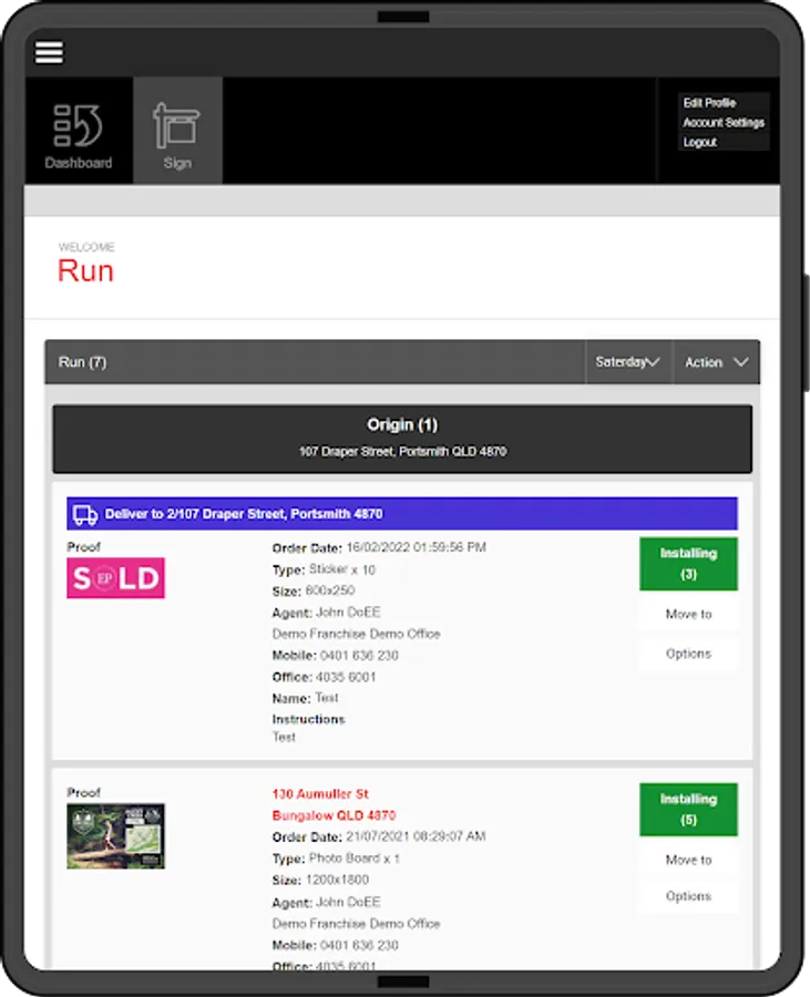 The PROLIST Driver App allows sign installers to have easy access to all of their runs, a map of their route, as well as for your sign production to know your location in real-time, enabling faster turnaround times for all of your customers.