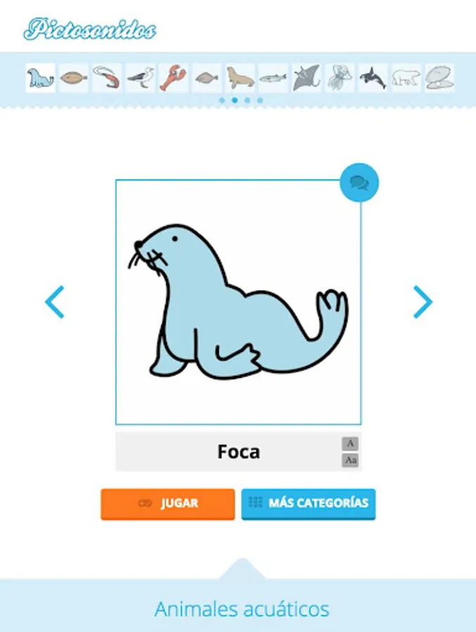 The operation of the website Pictosonidos is very simple, the pictograms are grouped into different categories; to access each category can be progressive one by one, or move the pictogram you want by the top panel for quick access to the icons of each category.