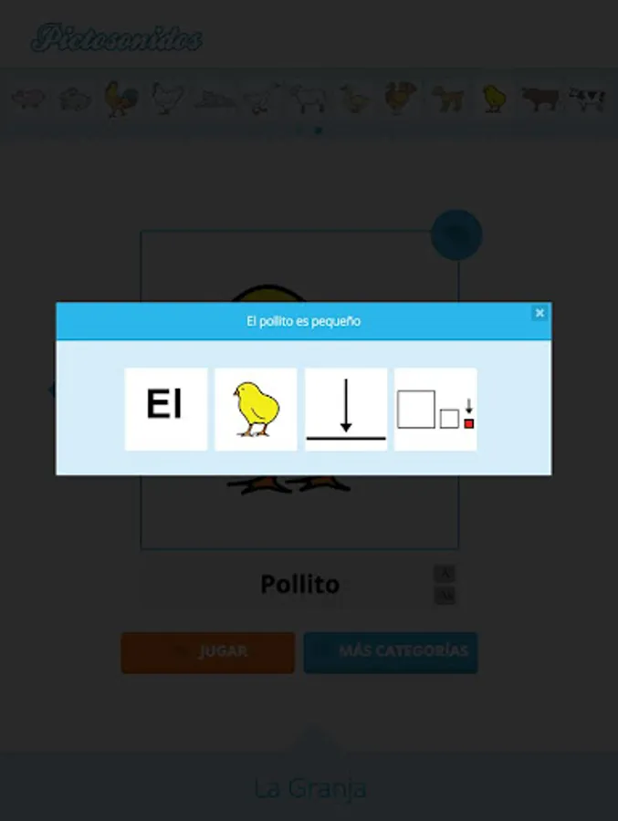 Each word in each category is associated with speech phrase including voice, for better assimilation of concepts, which is accessed by clicking on the icon conversation corner of the central pictogram, which will open a floating screen that reads Further the concept.