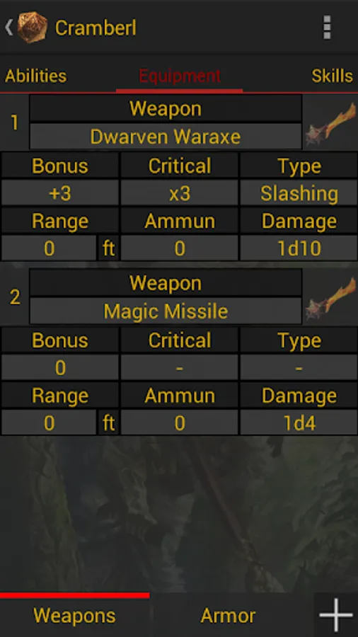 6) You can add your Weapons or generally your attacks in the Equipment page. Also you can add a roll action where you select die type,modifier,etc or just leave it empty if you want to use your real dice.