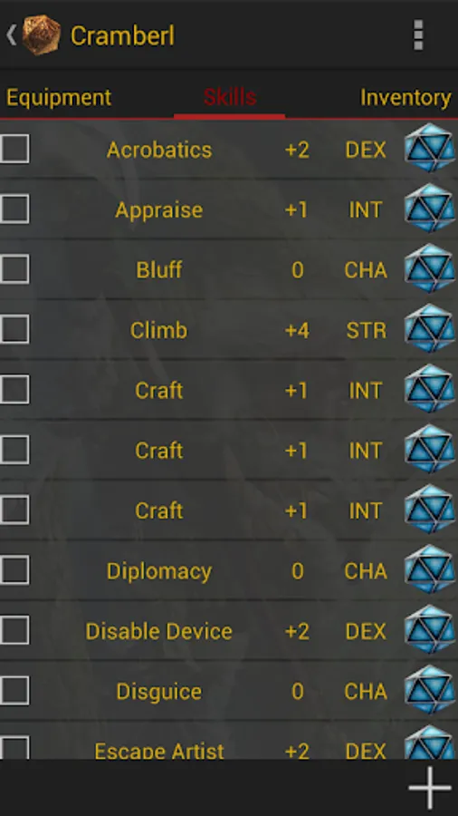 8) Standard skills are added when you create a new character, but you can add more skills if you want something extra. Moreover skills take the ability modifier automatically from the ability page. You only have to configure your ranks.