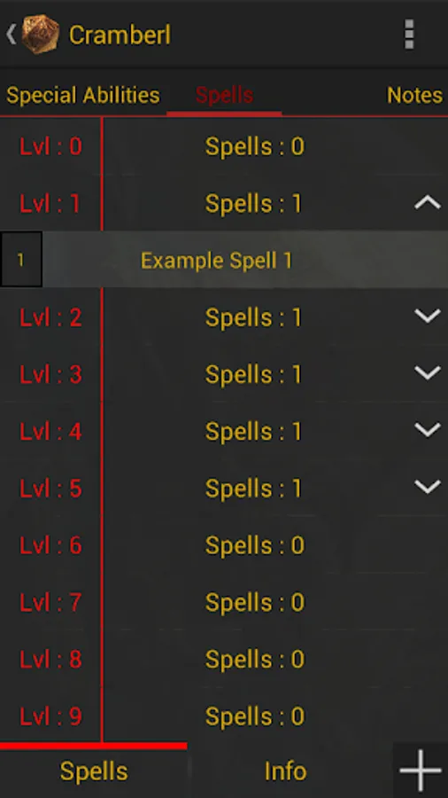 10) Spells are categorized by level. Also you can see how many spells of each level you know.