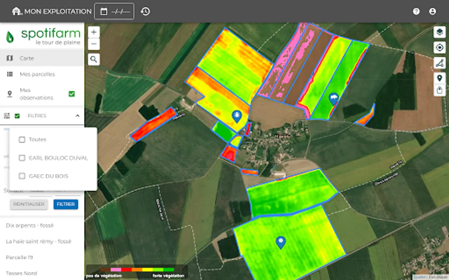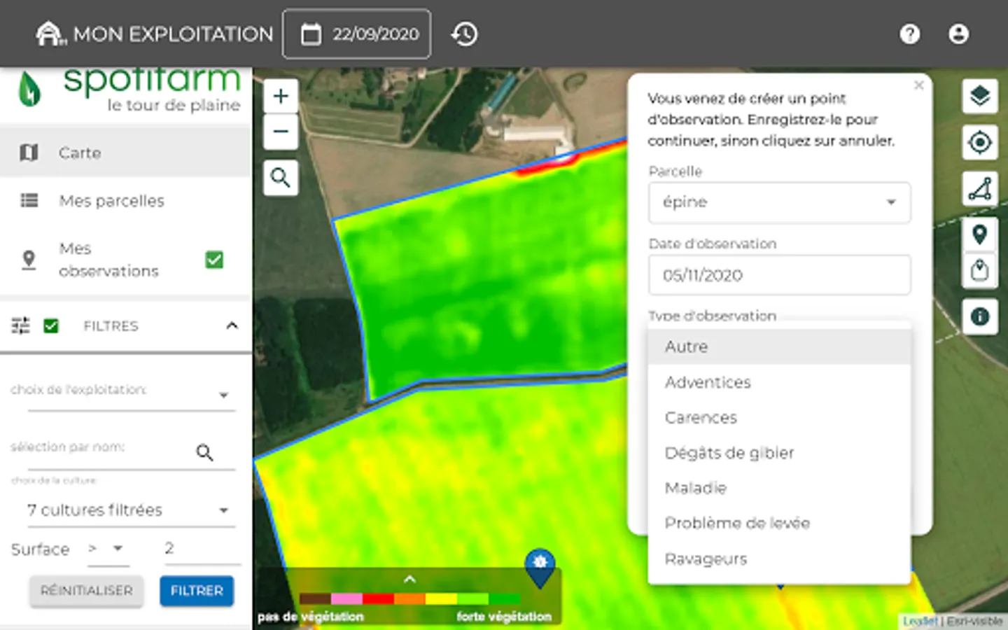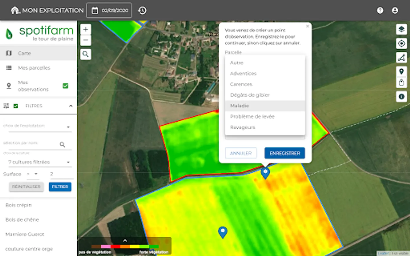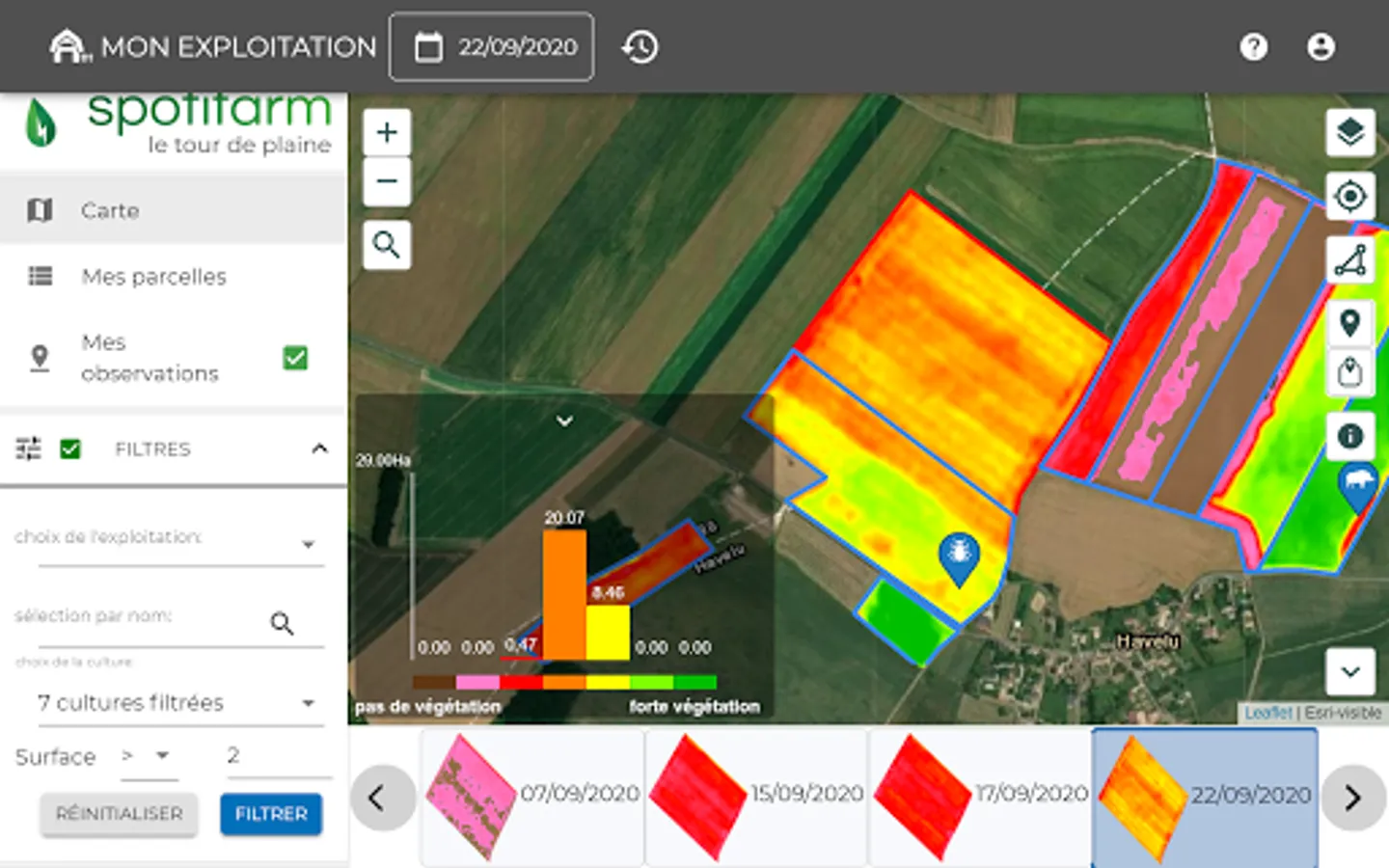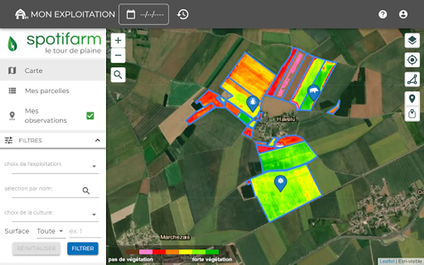Spotifarm is a mobile application designed for farmers and agricultural advisors. It helps them make the best decisions for crops thanks to remote sensing.