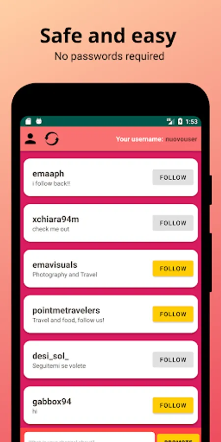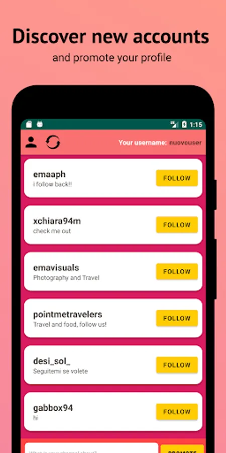 You can promote your account easily and quickly, discover new profiles, become popular and boost your account.