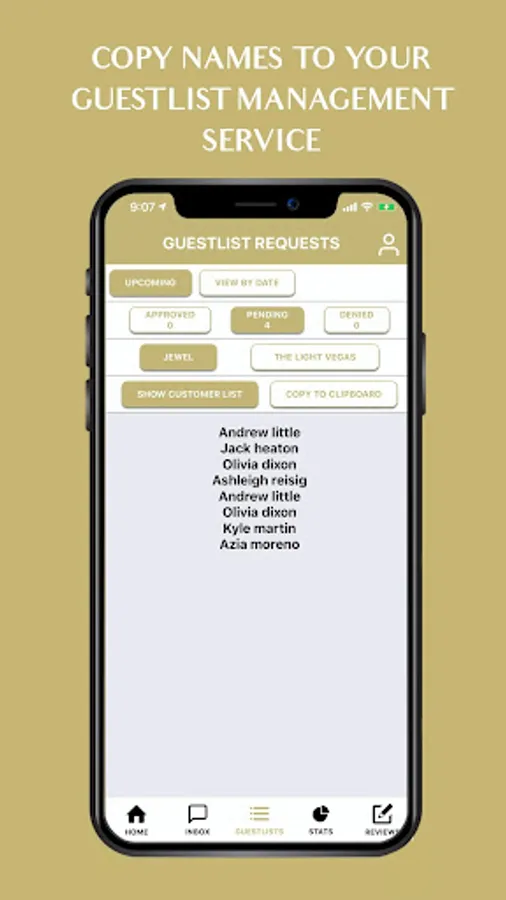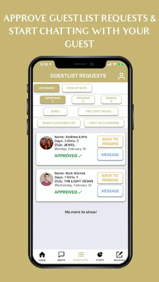 In this app you will be able to approve or deny guestlist requests, have your customers review you, see your stats by day, week, or month, and chat with your guests.