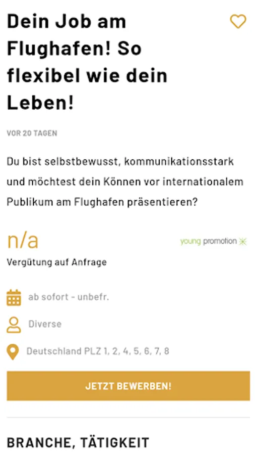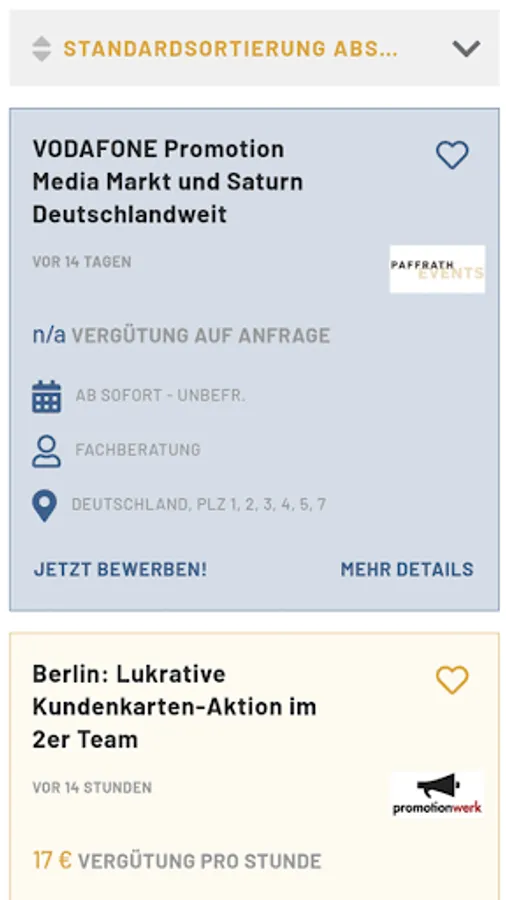 The app shows you all jobs from the hottest companies and agencies that are listed on a promotion basis. Individual filter settings for a radius search, activity, industry, type of employment, period of time or remuneration show the jobs that are relevant to you in the job listing, which you can also put on your watch list for later applications.