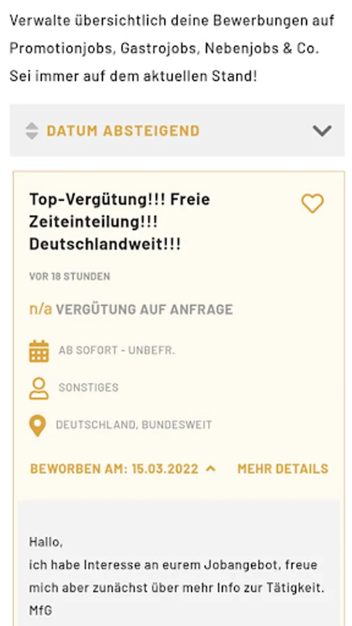 Whether student jobs, part-time jobs, holiday jobs or gastro jobs - with the Promotionbasis app you can apply quickly and easily directly by clicking on the application button from the job offer. The sedcard that is transmitted is automatically created from your stored profile data. You can also view and download this sedcard in the app. If your address, telephone number or other data have changed, you can easily update them. Your sedcard will then be automatically updated for the next application.