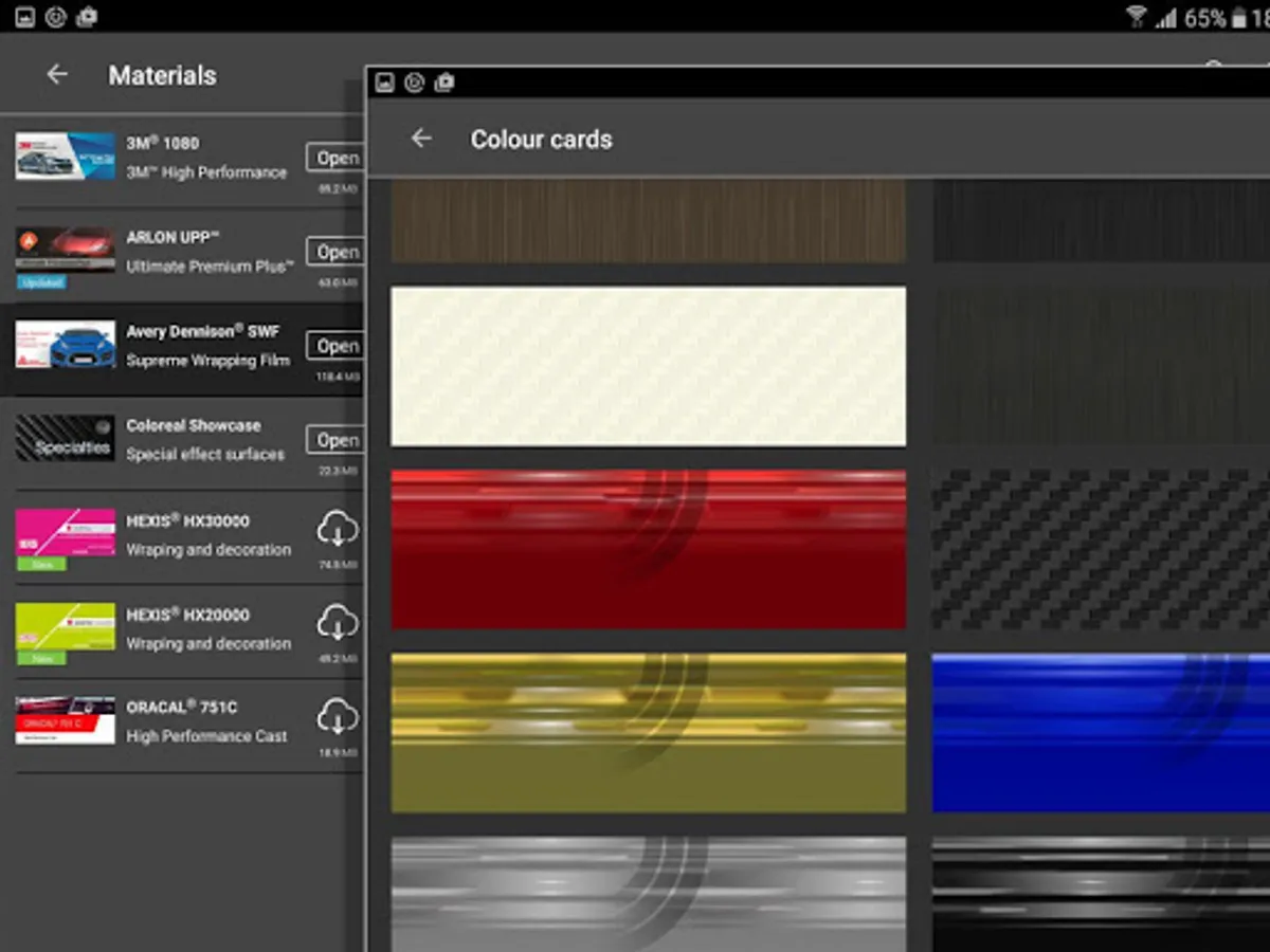 Choose desired material finish, carbon, metallic, pearlescent, … and see it on the car model with real life viewing experience.