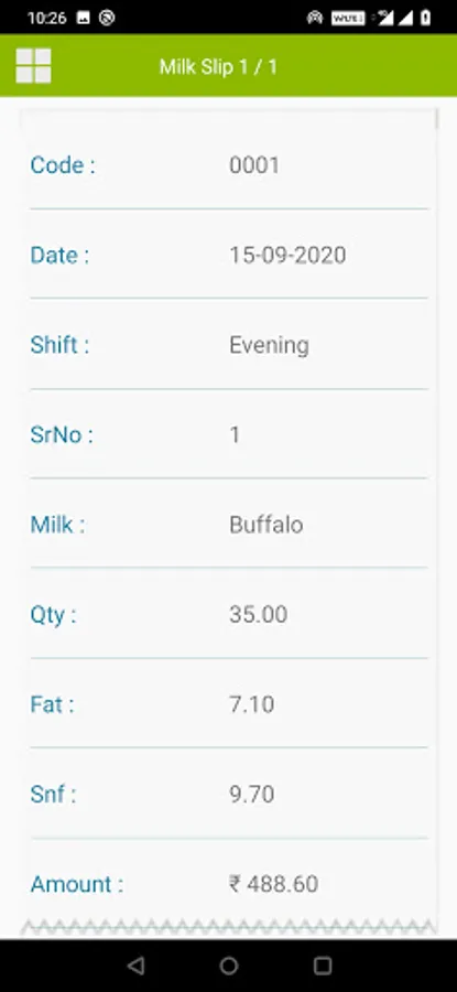 10. Farmers can get slip contains information like Animal Code & type, shift time Milk quantity, Fat Content, date & time of milk collection, and the amount paid to the farmer