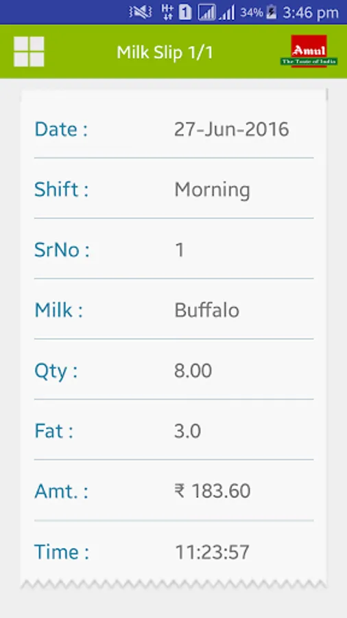 10. Farmers can get slip contains information like Animal Code & type, shift time Milk quantity, Fat Content, date & time of milk collection, and the amount paid to the farmer