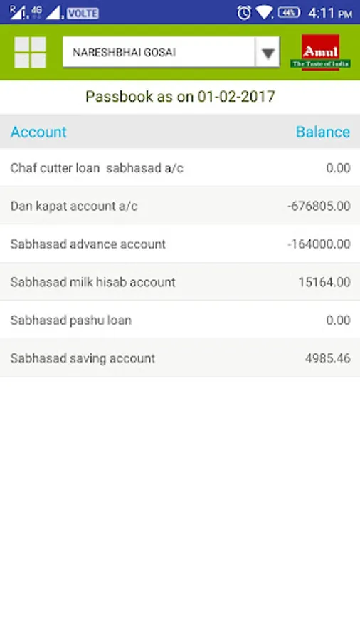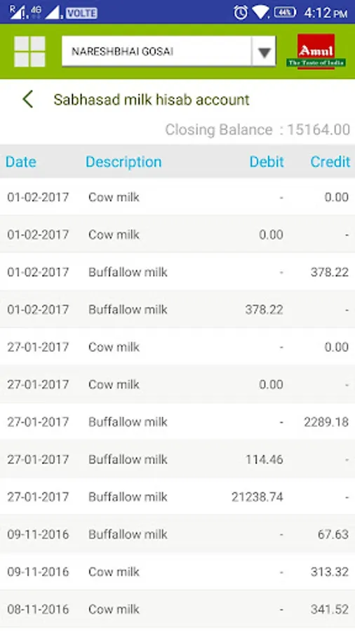 8. Farmers can view the transactions including amount credited & debited to the account, date period, and milk description along with total remuneration account balance.