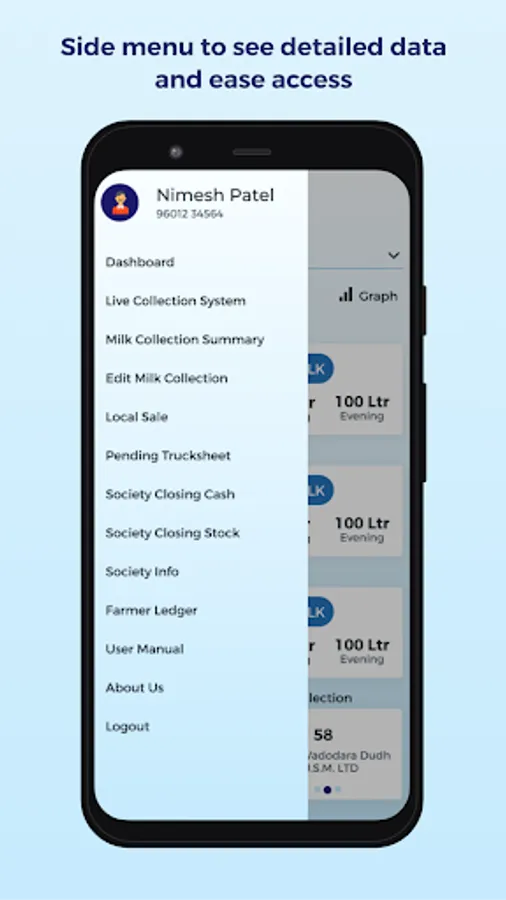 •A simple to follow user menu offers different choices provided by the application, such as the comprehensive app dashboard, real-time milk collection details, society-wise milk gathered, all the society-wise details.