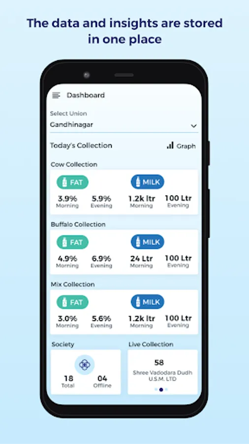 •The app offers the real-time status of society-wise milk collection and related performance directly to the involved Milk Union.
