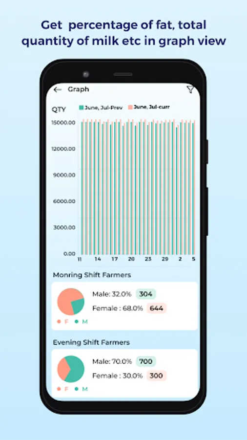 •With this application, the user can see the real-time milk collection based on any of the 3 filters offered. The filters comprise society-wise milk, shift-wise milk, and date-wise milk gathered, and the user can select from these provided options.