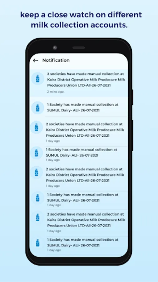 •The application also has the feature to send notifications which can include society count with details regarding manual milk collection by societies. All the notifications will be showcased on the app to keep a close watch on different milk collection accounts.