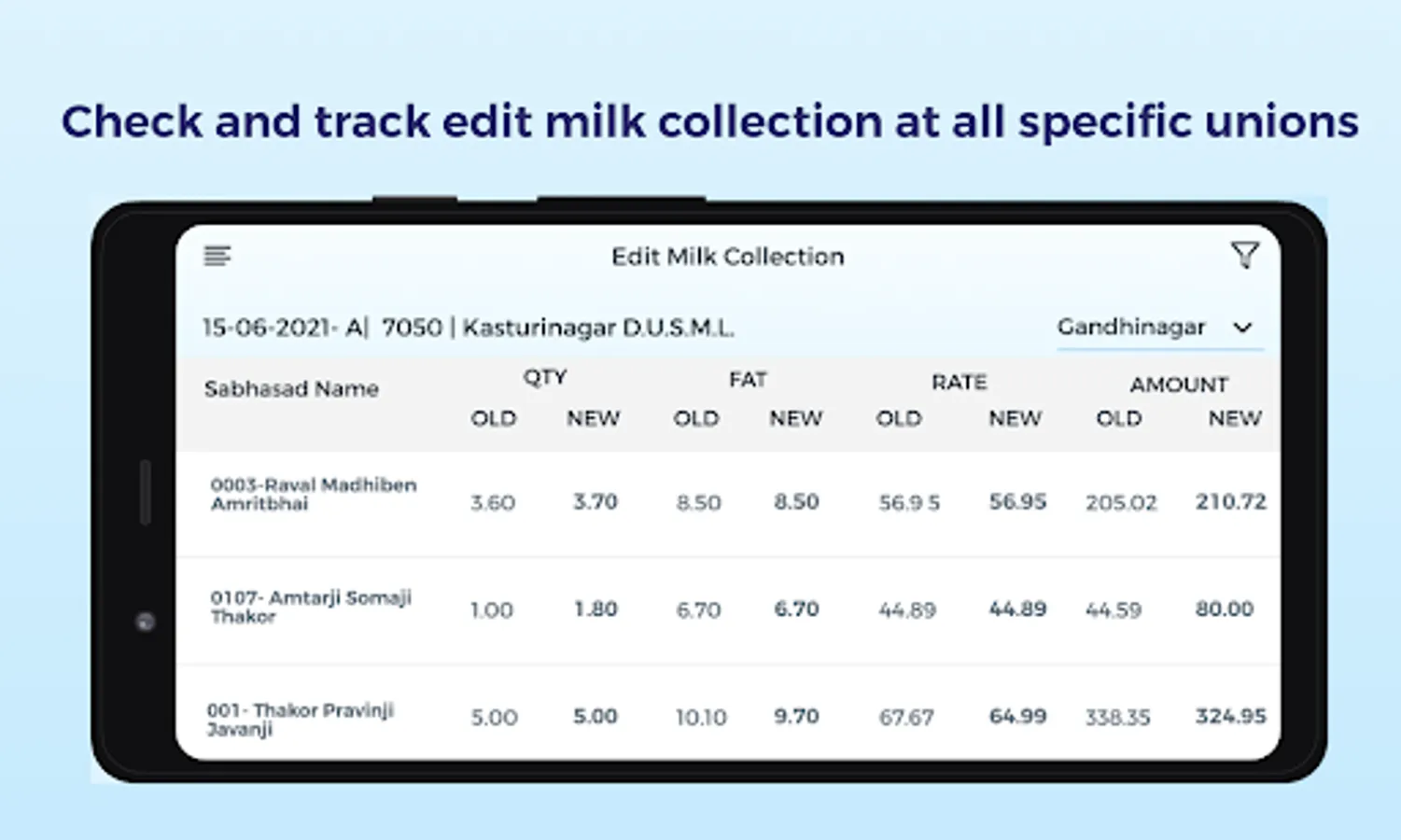•The application enables to check and track live milk collection at all specific unions. The window showcases data that includes the precise percentage of fat, total quantity of milk, the related payments, and attached sample number.