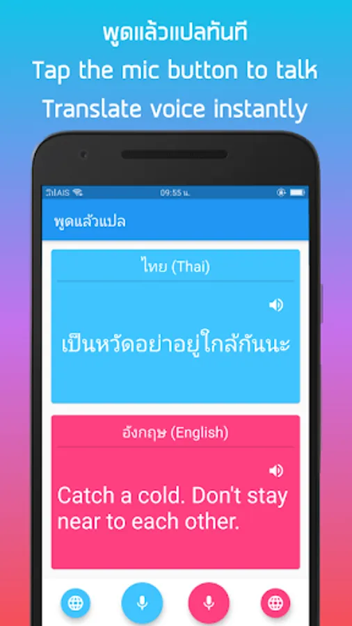 If you want to traval to Thailand and do not know how to speak Thai. This voice translator can help you. It can translate your voice from english to thai or thai to english instantly, just tap the mic and speak, your voice will be translated instantly.