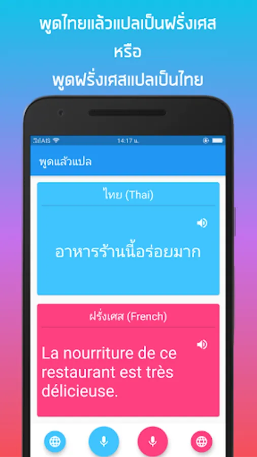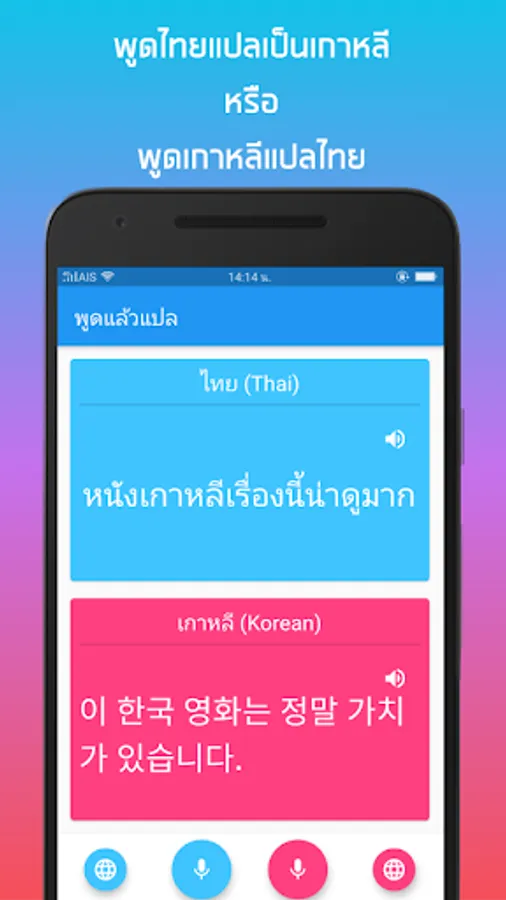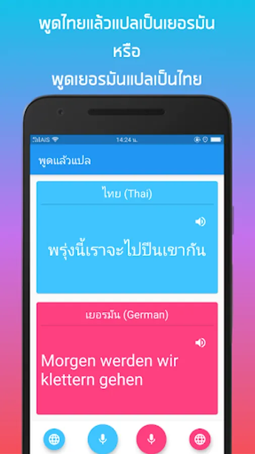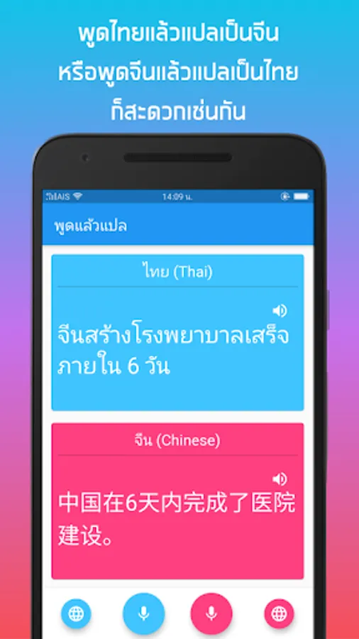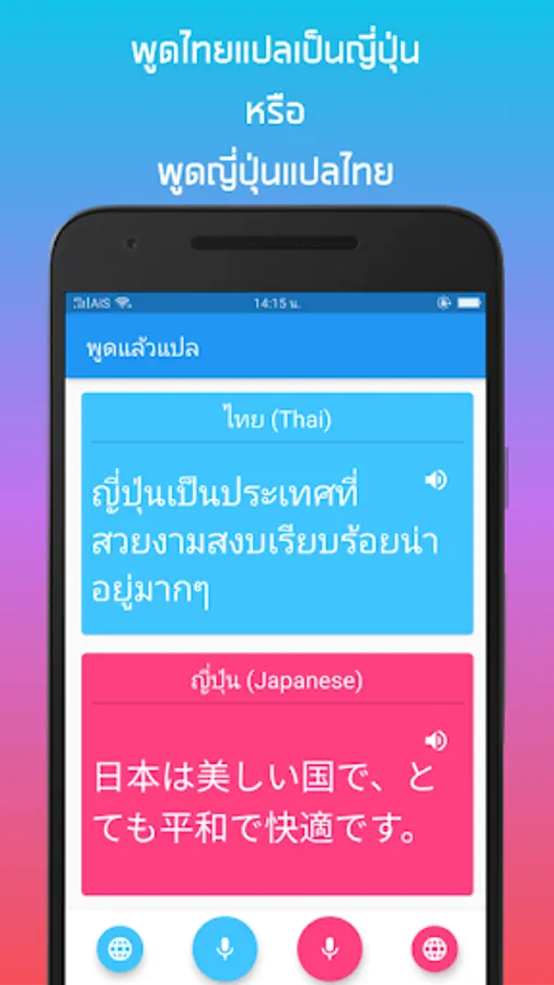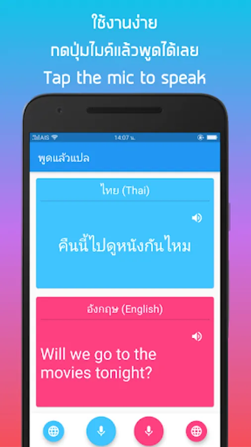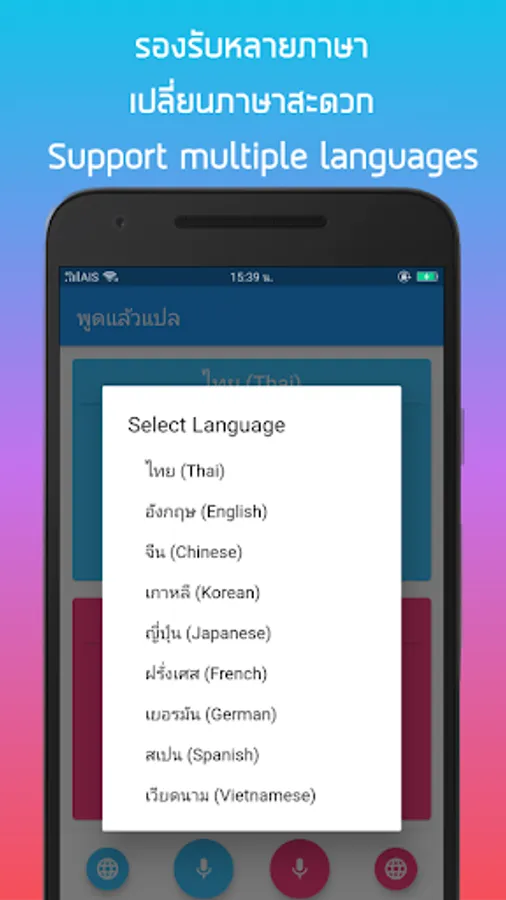 Besides Thai English translation, "Speak and translate". Supports many languages such as Thai, English, Chinese, Japanese, Korean, French, German, Spanish and Vietnamese. Simply select your language.
