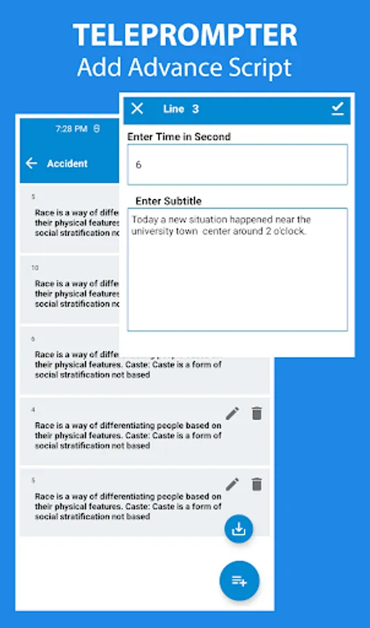 This is suitable cue prompter app for top singers, broadcasters and musician to speak fluent in front of camera while reading normal or advance script. Add advance script. How? First enter advance script title and save it. Then add line along with advance script title. Enter time like 1, 2, 3, 4, and 5 and then enter subtitle. Now save this script to display in the background of teleprompter camera. You can also add script from txt file to display with video.