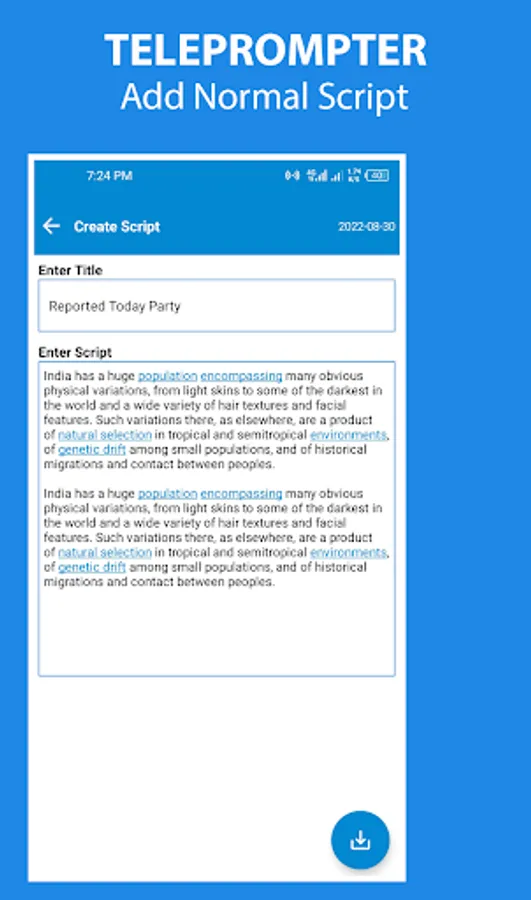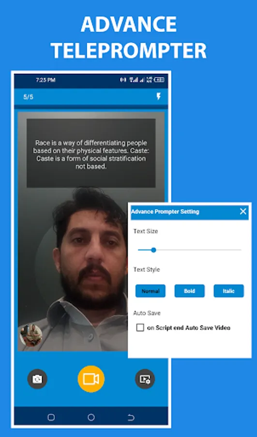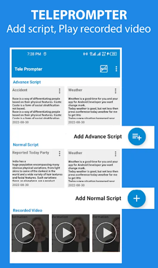 This is an outstanding video Teleprompter app for adding normal and advance script to teleprompter camera for recording videos, interviews etc. How? First enter script title and then create script with easyprompter. Finally, add normal script in front of camera teleprompter. The script will be visible in background of autocue teleprompter.