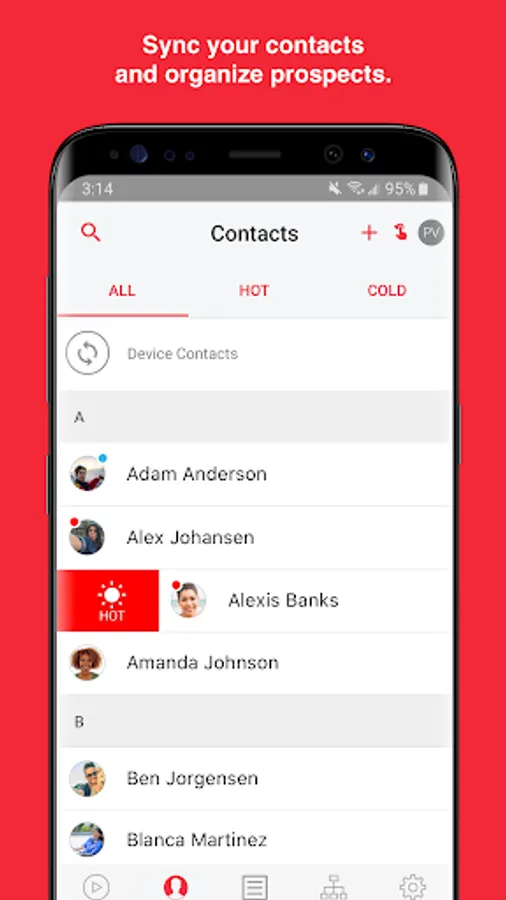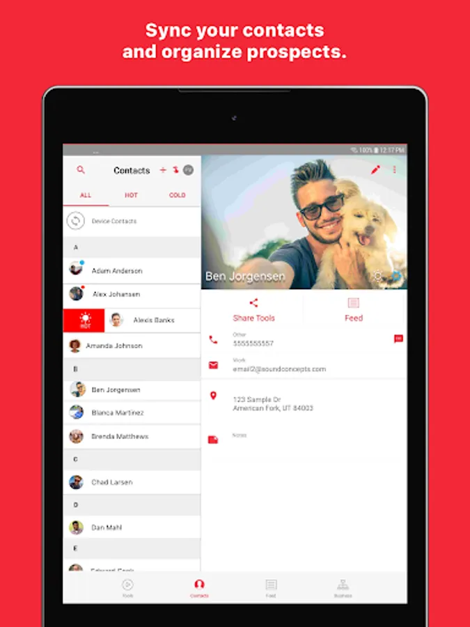 Contacts: Choose how to sync and manage your contacts. Swipe to sort them by interest level. You can make connections, add notes, or check out the Contact Feed to see the tools you've shared and contact actions.