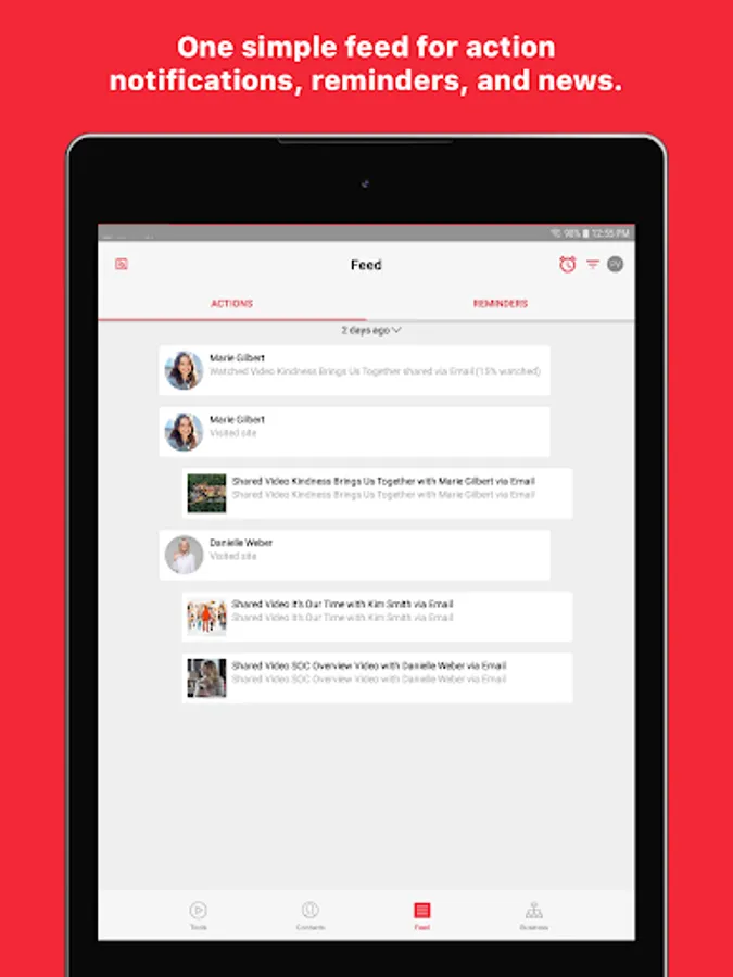 Feed: Keep track of everything you’ve shared and see what your contacts have viewed with notifications. You can even swipe notifications to mark them as a Reminder. News also brings all of the latest announcements and social posts from corporate straight to you in one convenient place!