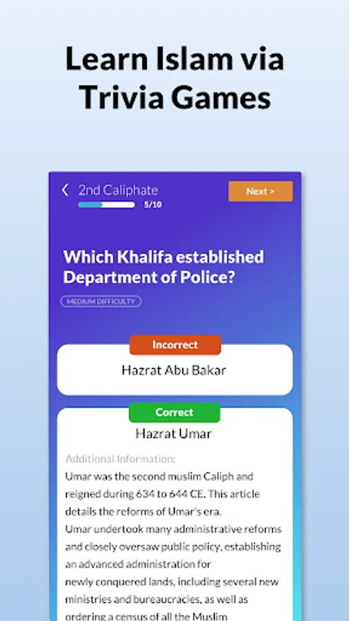 - Play and learn across categories like Ramadan, Quran, Prophet Muhammad (PBUH), Islamic History, Islamic principals, Pre-Islamic history, Rise of Islam, etc
