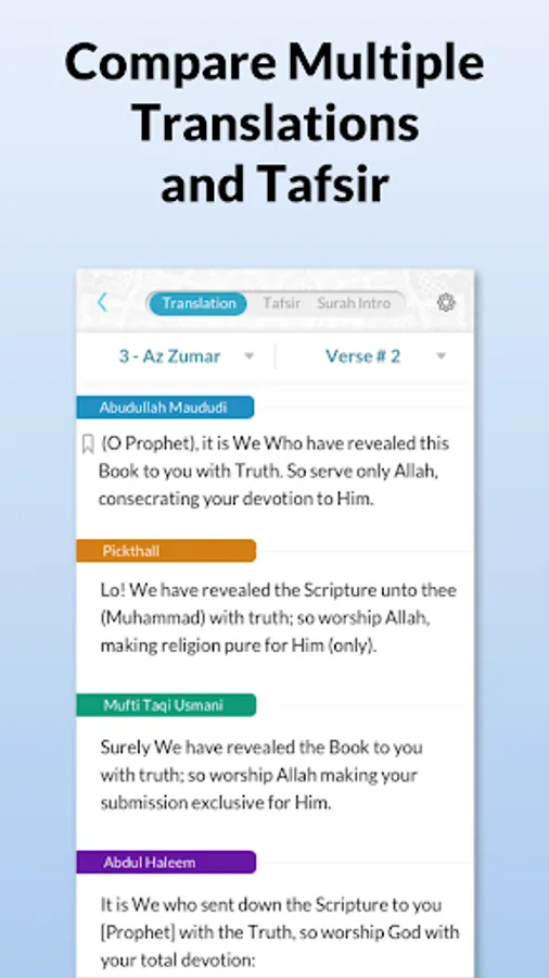- Multiple Quran's translations from Abdul Haleem, Dr Mustafa Khattab, Mufti Taqi Usmani, Muhsin Khan, Pickthall, Shahi, Talal Itani and Yusuf Ali.