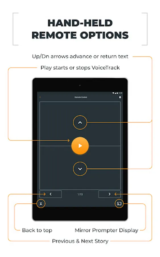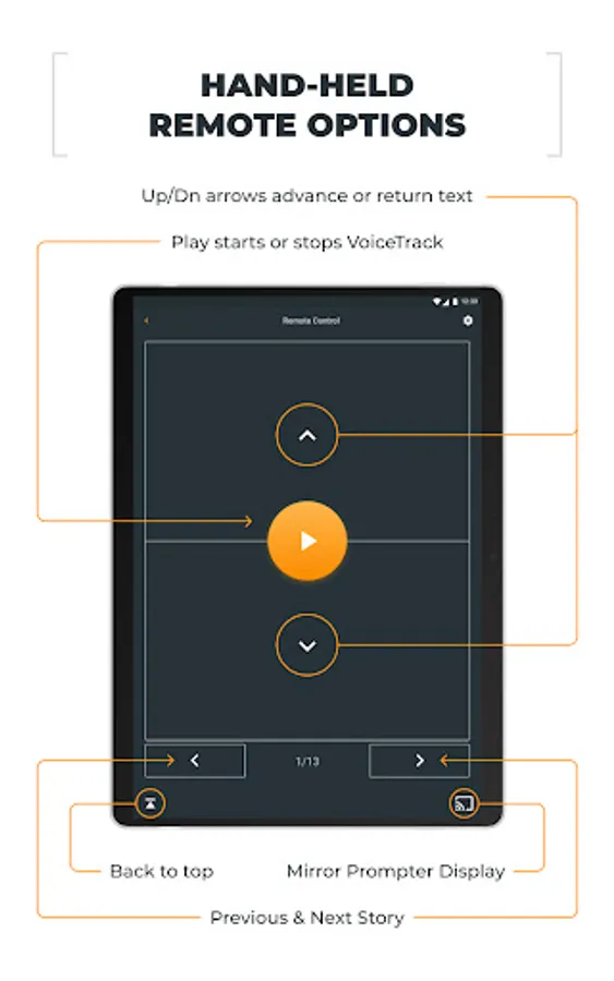 The Remote Control allows you to mirror the screen of your prompter display so that the content of the teleprompter display can be viewed and re-positioned from a distance.