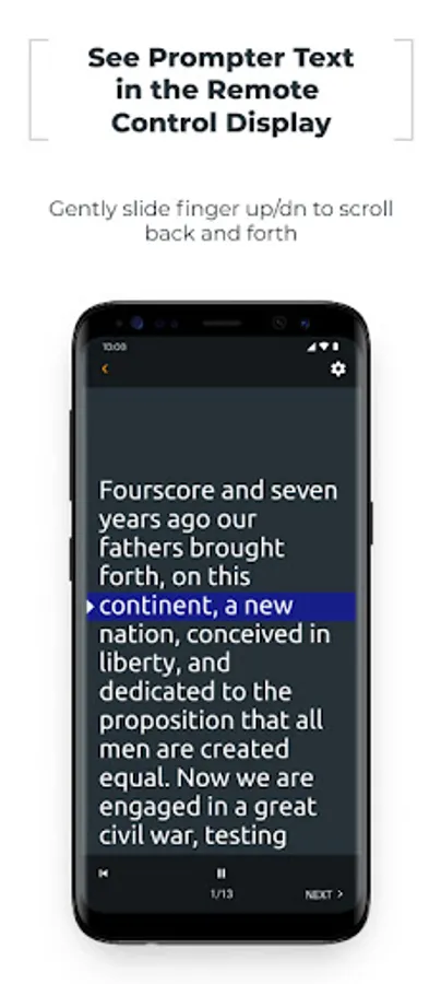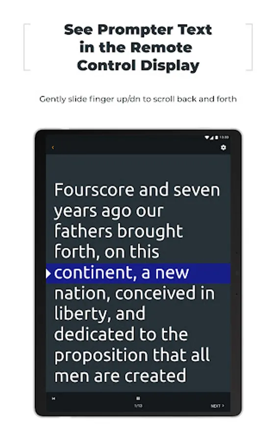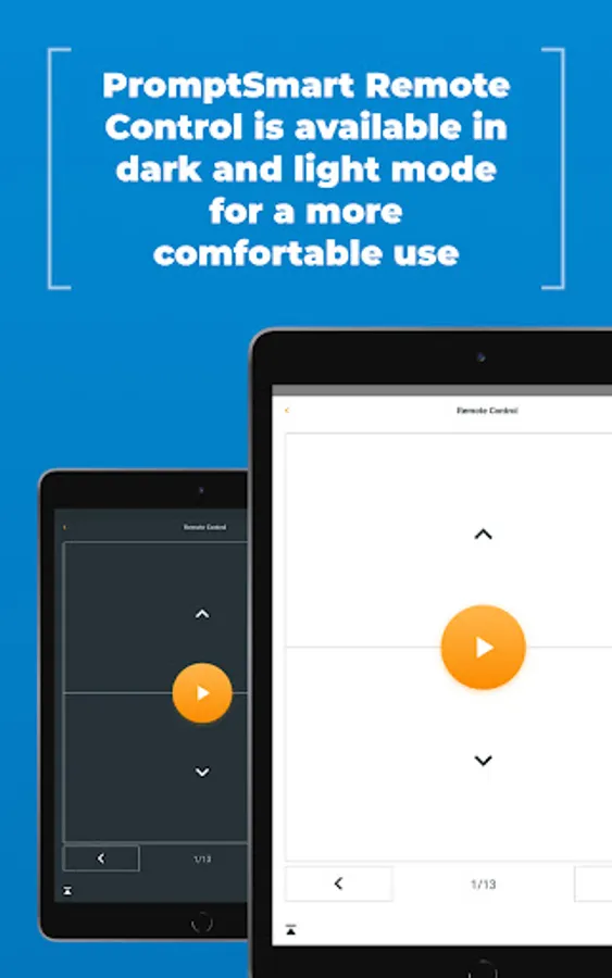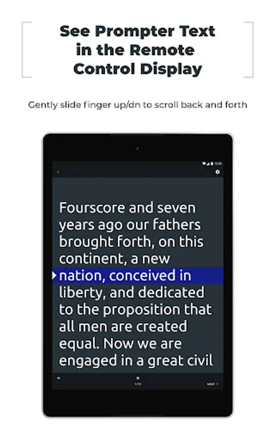 PromptSmart+ Remote is a companion app to the PromptSmart+ teleprompter app (subscription required) that lets you control the scrolling of your content with a simple tap of your finger to move it forward or backward, start/stop your presentations, and return to the beginning.