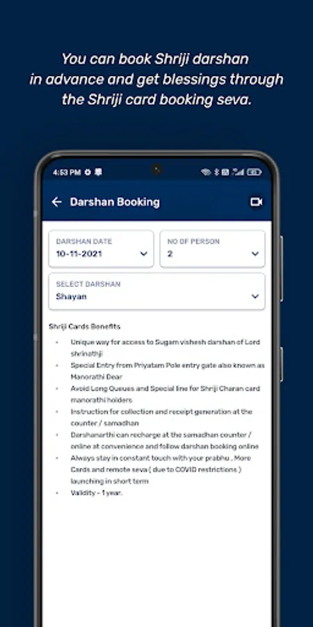 You can book Shriji darshan in advance and get blessings through the Shriji card booking seva.