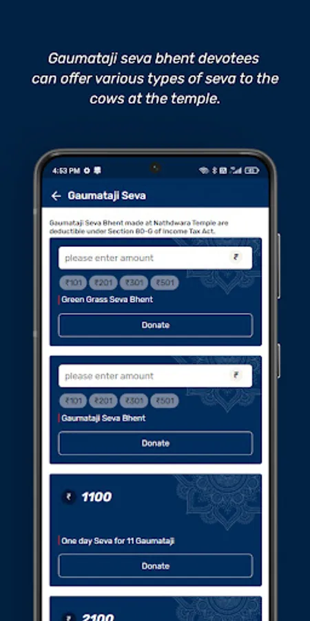 With the Gaumataji Seva Bhent, devotees can offer various types of seva to the cows at the temple.