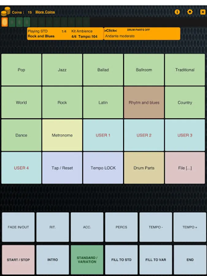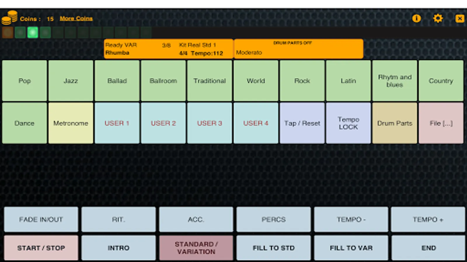 - User section where to store your favorite rhythms with tempo change and mute drum parts