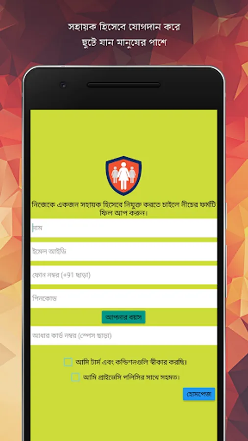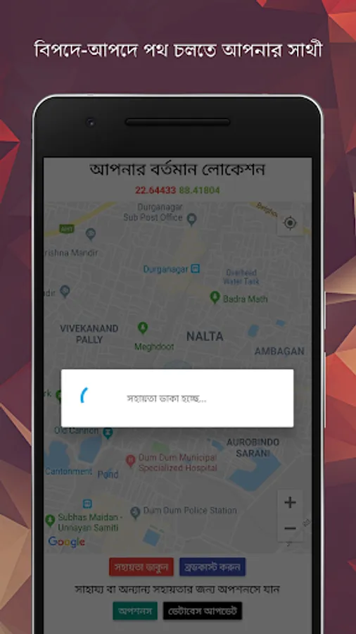 The 'সহায়তা ডাকুন' button will send an SMS with your current geo-location to all the registered Sahayaks (local volunteers) and also call the Kolkata police women's helpline number.