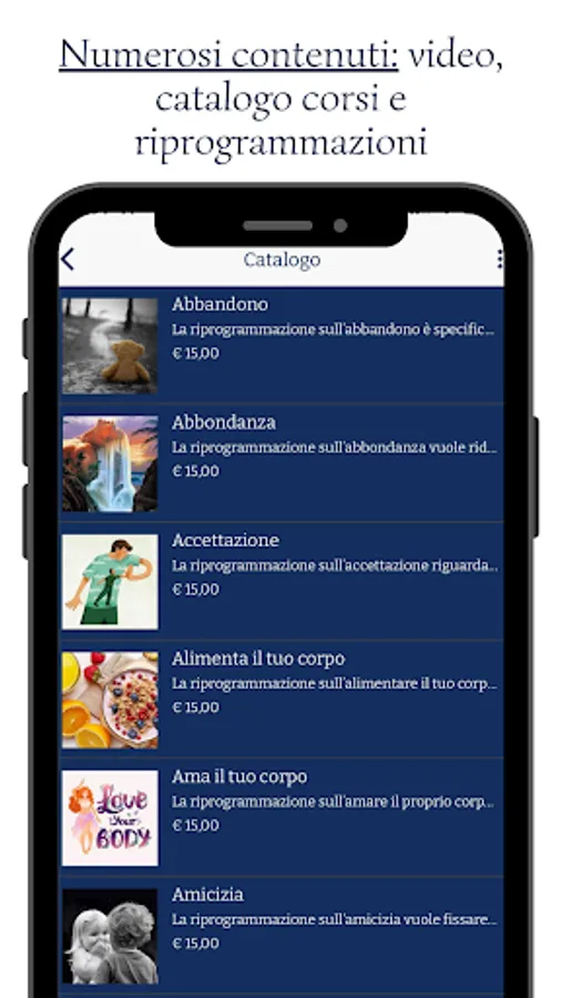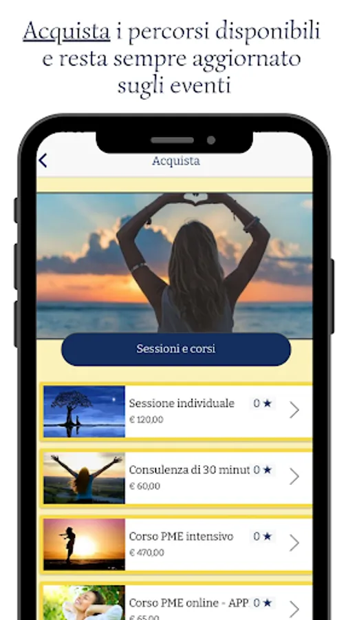 Through the app you can view what the path is and what it is characterized by, who Monica is, access in-depth information with specific explanations on how to participate in the path, informative webinars, purchase individual sessions, audio reprogramming or routes.