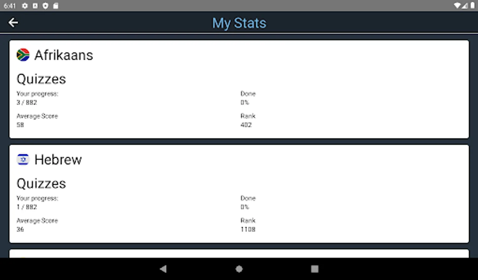 1) Free. You can take the Comprehensive Afrikaans Test (non-adaptive) in any language, containing 882 quizzes, and receive a free certificate of proficiency with your CEFR score upon completion. The comprehensive test is the largest such test in the world and takes about 70 hours to complete. You can do the test at your own pace, over as many days as you like. A leaderboard displays your rank against all other test-takers worldwide, and you can easily track your progress at any time.