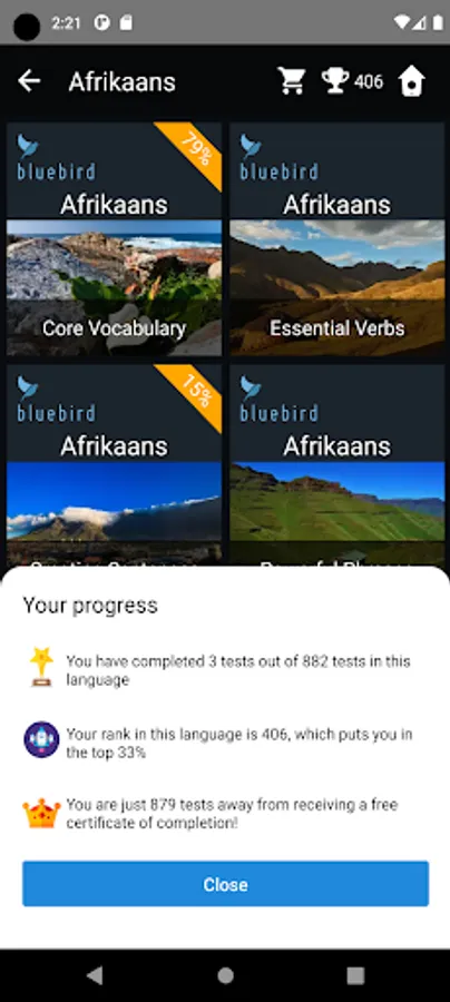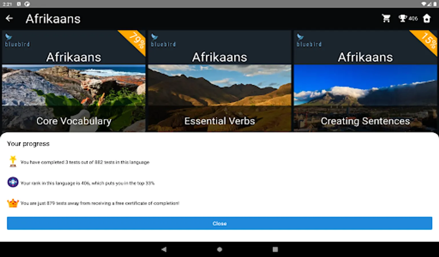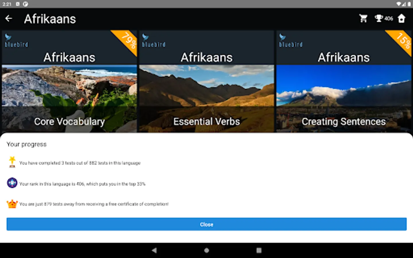 Bluebird Afrikaans Tests evaluates your knowledge of Afrikaans and provides an official PDF certificate of proficiency with your CEFR score (Common European Framework of Reference for Languages).