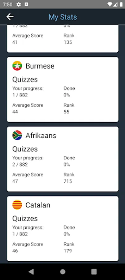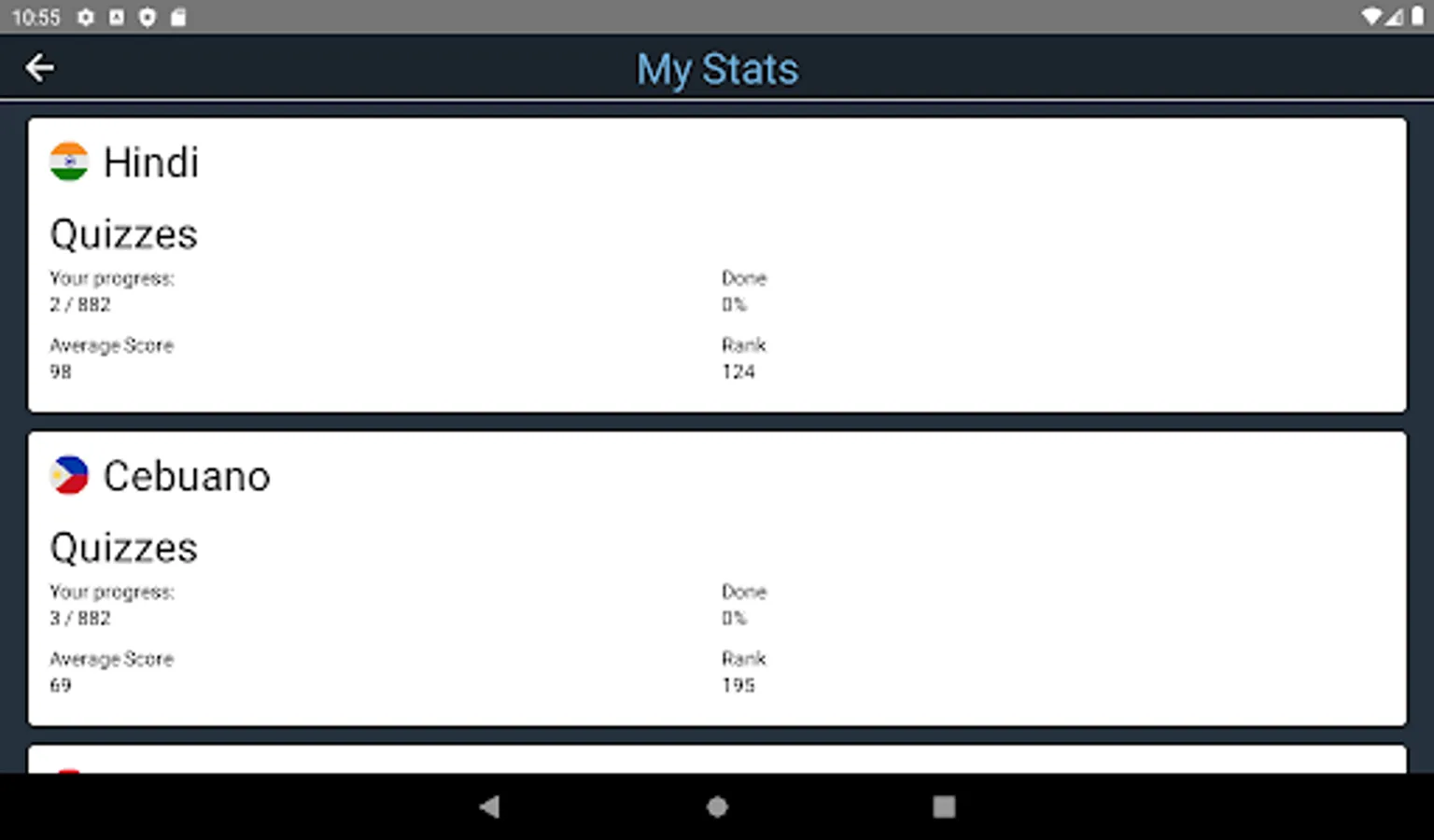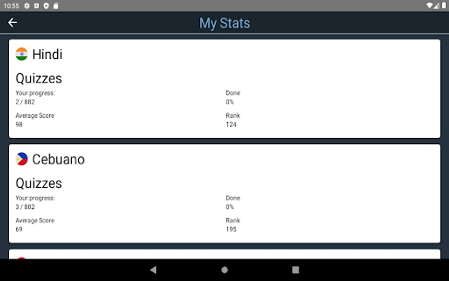 1) Free. You can take the Comprehensive Cebuano Test (non-adaptive) in any language, containing 882 quizzes, and receive a free certificate of proficiency with your CEFR score upon completion. The comprehensive test is the largest such test in the world and takes about 70 hours to complete. You can do the test at your own pace, over as many days as you like. A leaderboard displays your rank against all other test-takers worldwide, and you can easily track your progress at any time.