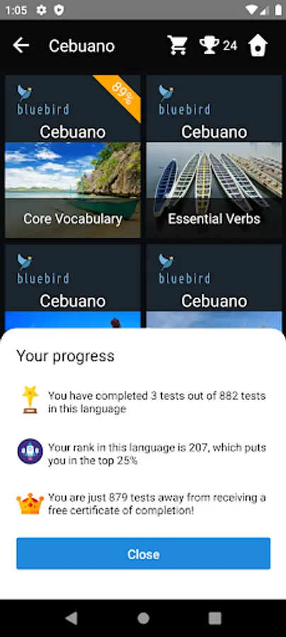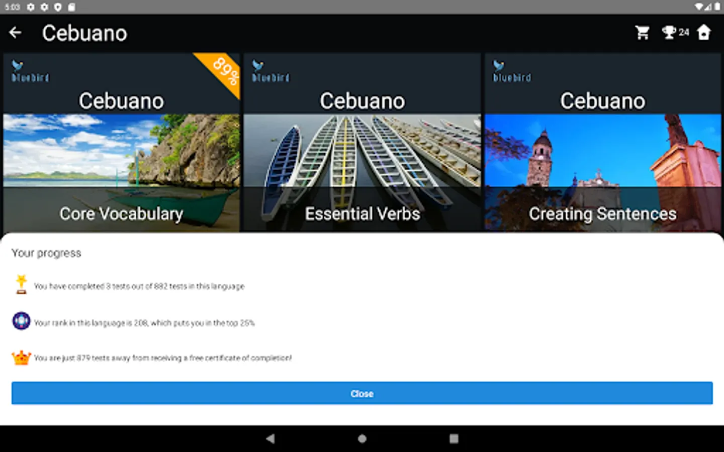 Bluebird Cebuano Tests evaluates your knowledge of Cebuano and provides an official PDF certificate of proficiency with your CEFR score (Common European Framework of Reference for Languages).