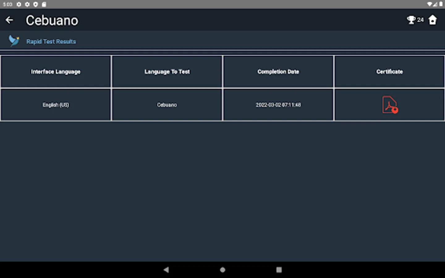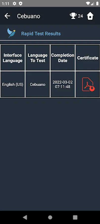 2) Paid. For a low fee, you can take our Rapid Cebuano Adaptive test, which will provide you with a certificate of proficiency with your CEFR score in just 45 minutes. The rapid test uses questions that are progressively more difficult to accurately gauge your level of proficiency.