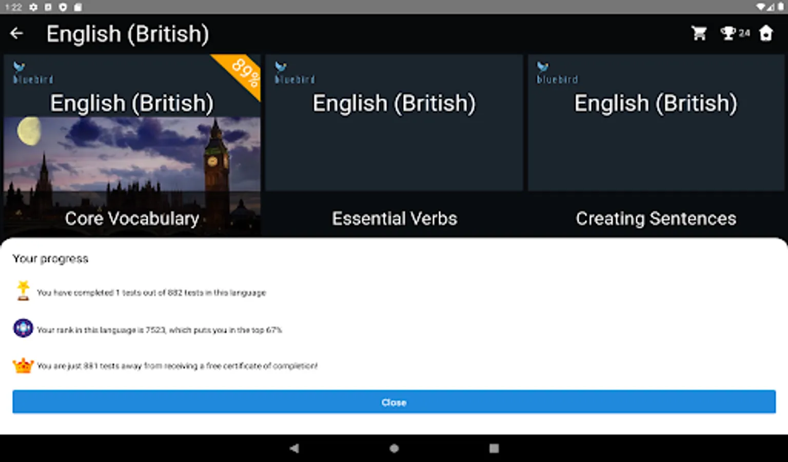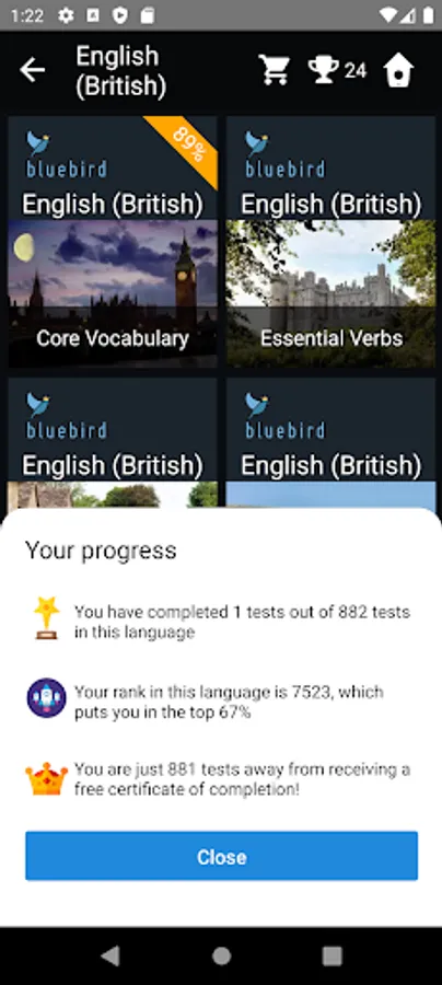 Bluebird British English Tests evaluates your knowledge of British English and provides an official PDF certificate of proficiency with your CEFR score (Common European Framework of Reference for Languages).